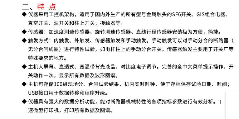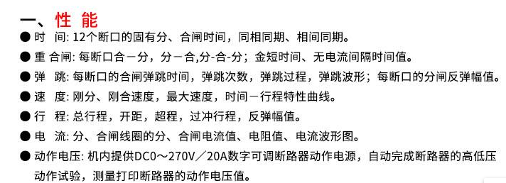| l HTGKC-12F高壓開關測試儀適用于國內外生產的所有型號的SF6開關、GIS組合電器、真空開關、油開關的機械特性試驗。 l 超強的抗干擾能力,在500KV變電站旁路母線帶電的情況下,也能輕松試驗,精確測量。 l 通用式測速傳感器,直線傳感器,旋轉傳感器,安裝極為方便、簡捷。 l 開關動作一次,得到開關機械特性試驗所有數據及相應的波形圖譜。 l 主機可存儲現場試驗數據,機內實時時鐘,便于存檔保存試驗日期、時間。 l 主機大屏幕、寬溫度、直透視、背景光液晶、全中文顯示所有數據及圖譜,液晶對比度電子調節、斷電記憶。 l 中文菜單操作,使用方便。儀器內置打印機,隨時快速打印所有數據及圖譜。 開關測試儀技術參數 1、使用環境 溫 度: -10~40℃ 濕 度: ≦80%RH 2、安全性能 絕緣電阻: >2MΩ 介電強度: 電源對機殼工頻1.5KV耐壓1分鐘,無閃絡與飛弧。 3、基本參數 (1)時 間:量程 4000.0ms 分辯率0.1ms